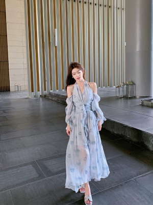 ByYou 夏季新款气质蓝色雪纺露肩挂脖碎花连衣裙收腰薄款V领长裙