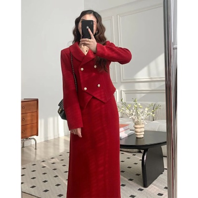 秋冬小香风红色套装裙女2025年冬季新款毛呢气质名媛两件套高级感