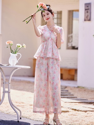 名媛高端雪纺套装女2025夏季新款时尚洋气遮肚子欧货阔腿裤两件套