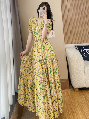 黄色碎花连衣裙法式茶歇收腰显瘦气质长裙雪纺裙子女2025夏季新款