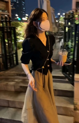 2025新款法式气质方领黑色连衣裙子女装夏季显瘦小个子蓬蓬小黑裙