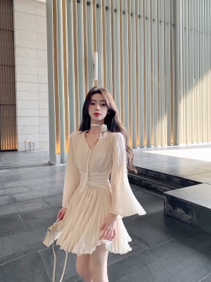 ByYou 夏季新款杏白色v领喇叭袖百褶雪纺连衣裙气质收腰短裙a字裙