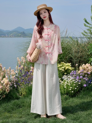 新中式盘扣天丝套装女夏2025新款气质巨好看优雅亚麻阔腿裤三件套