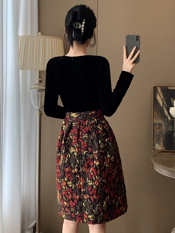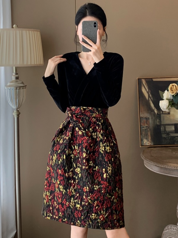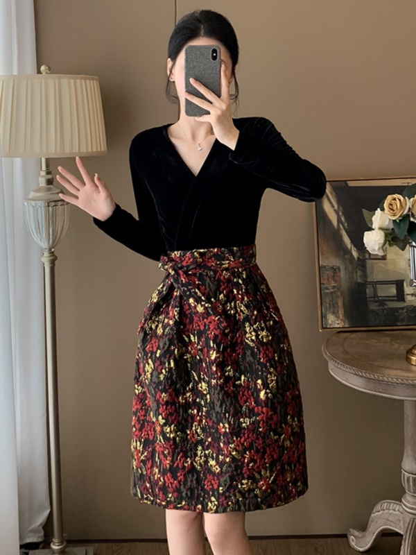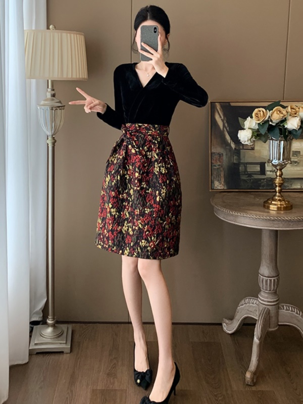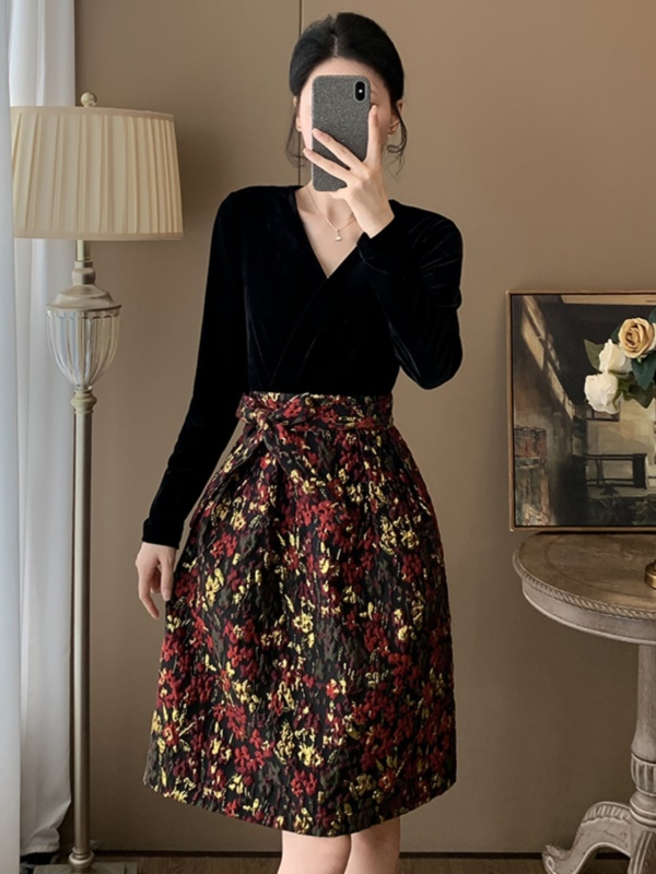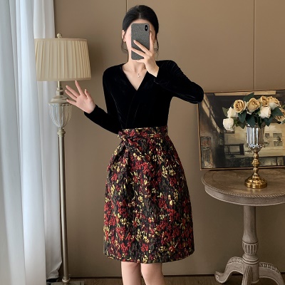 秋季新款假两件丝绒V领蓬蓬连衣裙高级感显瘦高端气质宴会晚礼服