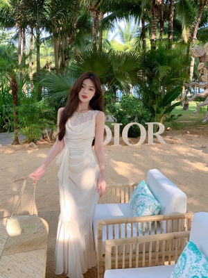 ByYou 夏季新款温柔风蕾丝无袖白色连衣裙长款修身收腰包臀鱼尾裙