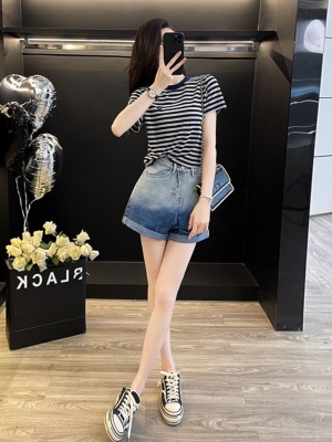 休闲运动套装女夏季炸街减龄时尚小个子条纹T恤牛仔短裤两件套潮
