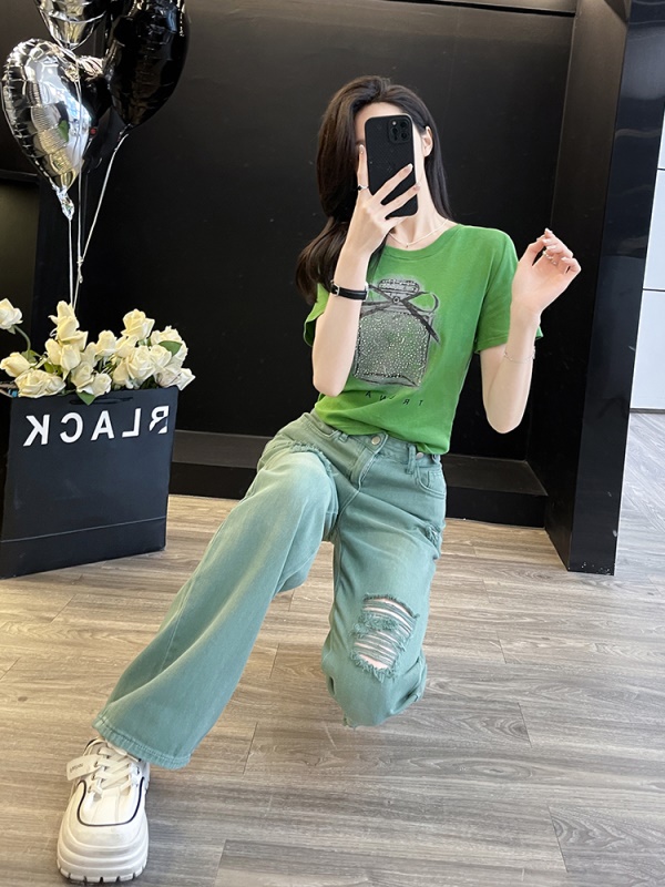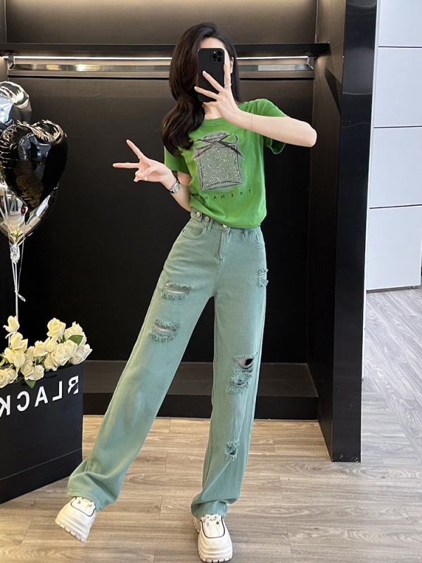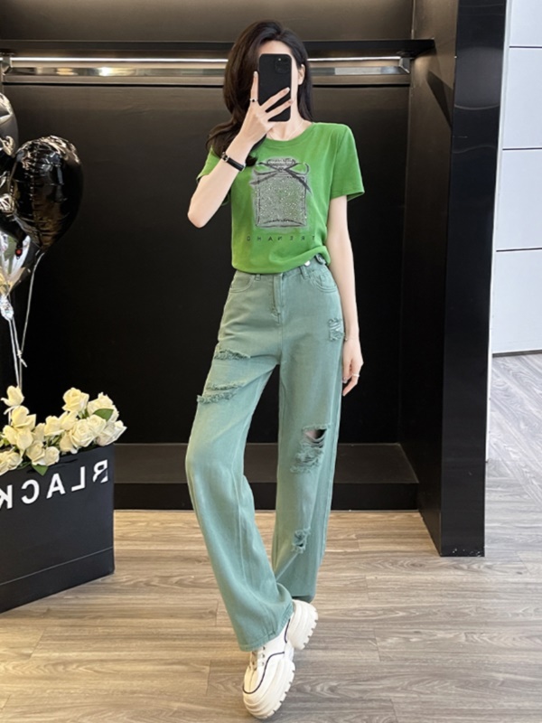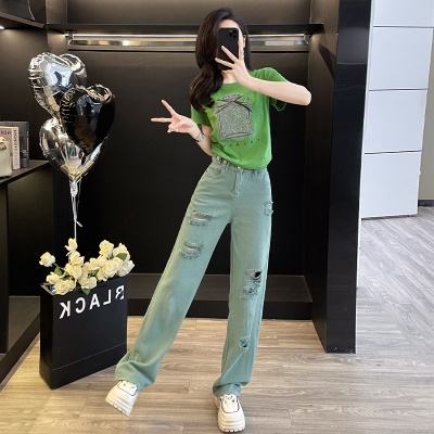 商品名称:多巴胺绿色休闲时尚套装女夏季炸街减龄短袖破洞牛仔阔腿裤两件套