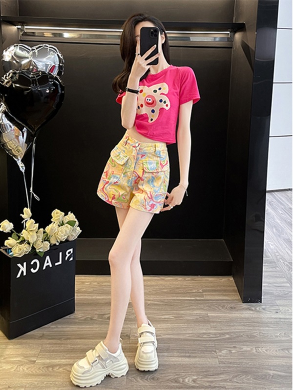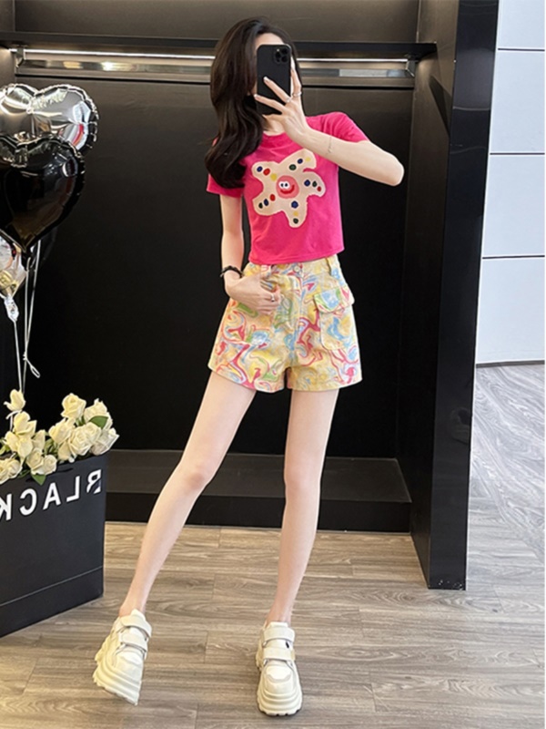 商品名称:多巴胺休闲运动套装女夏季炸街洋气时尚短袖花色牛仔短裤两件套潮