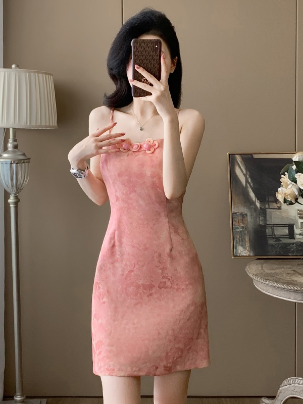 ByYou 夏季新中式国风印花缎面吊带连衣裙高级感收腰显瘦包臀长裙