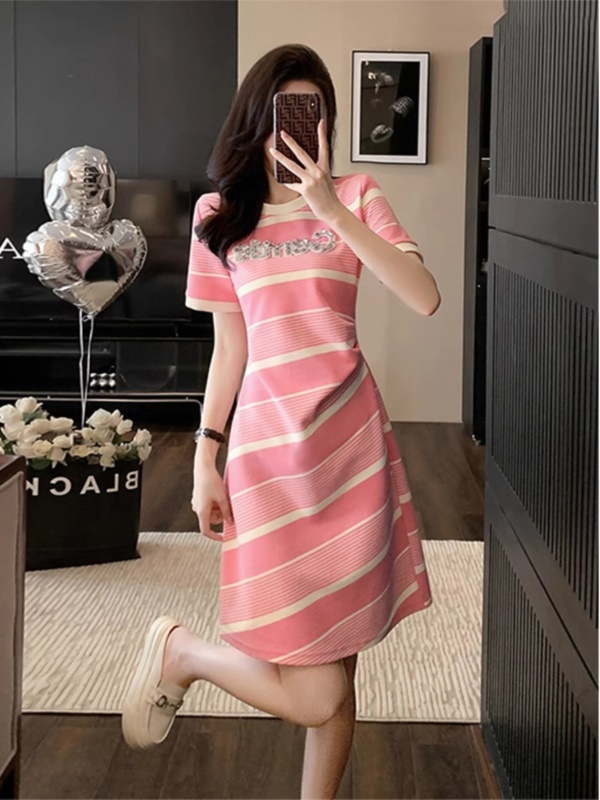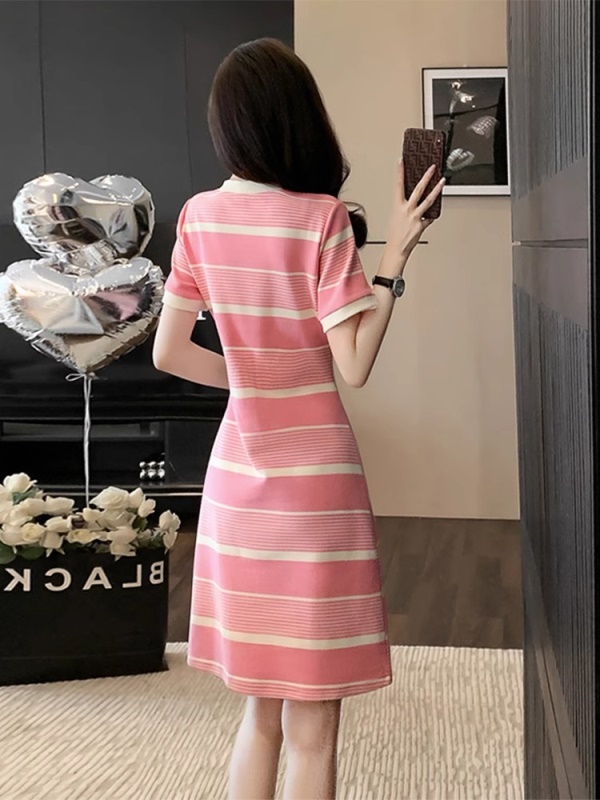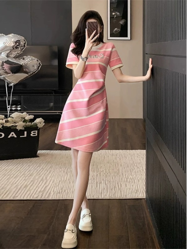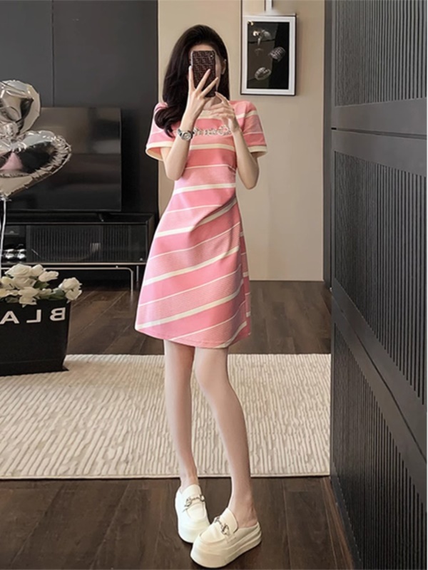 商品名称:粉色法式连衣裙2025新款收腰洋气质显瘦条纹时尚休闲t恤裙子女夏