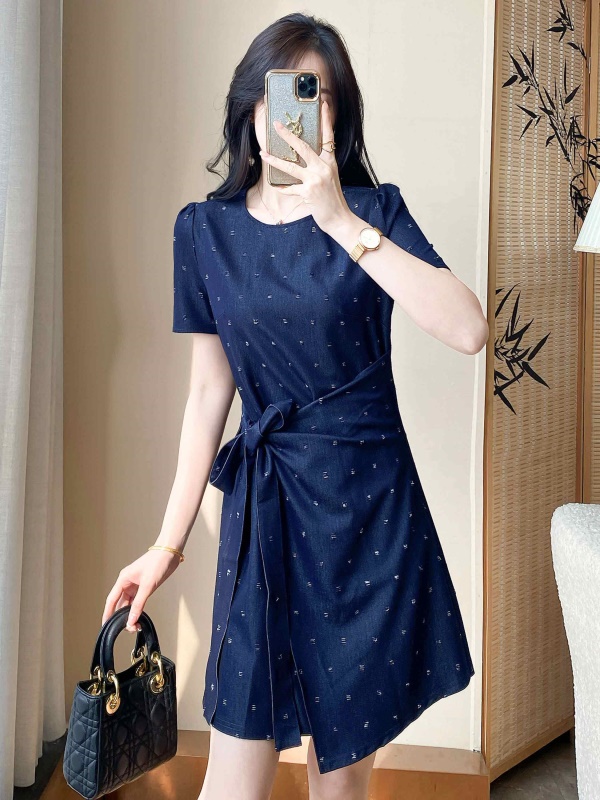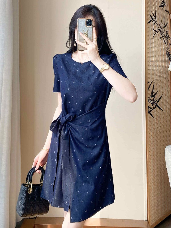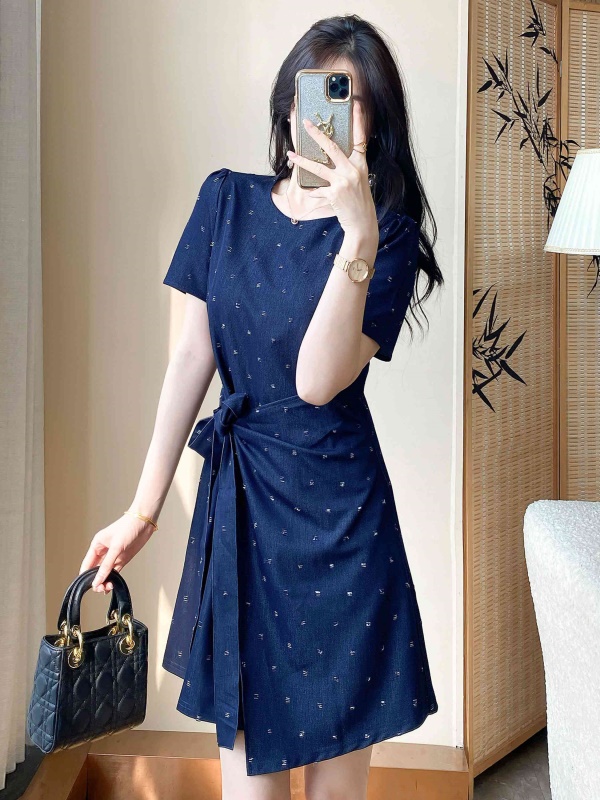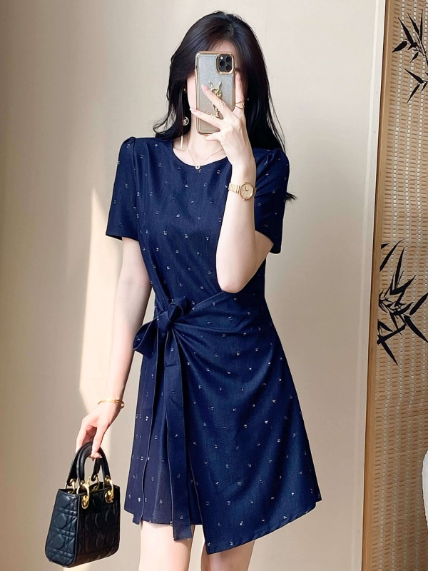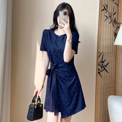 法式小香风蓝色连衣裙女夏季2025新款高级感气质显瘦收腰褶皱裙子