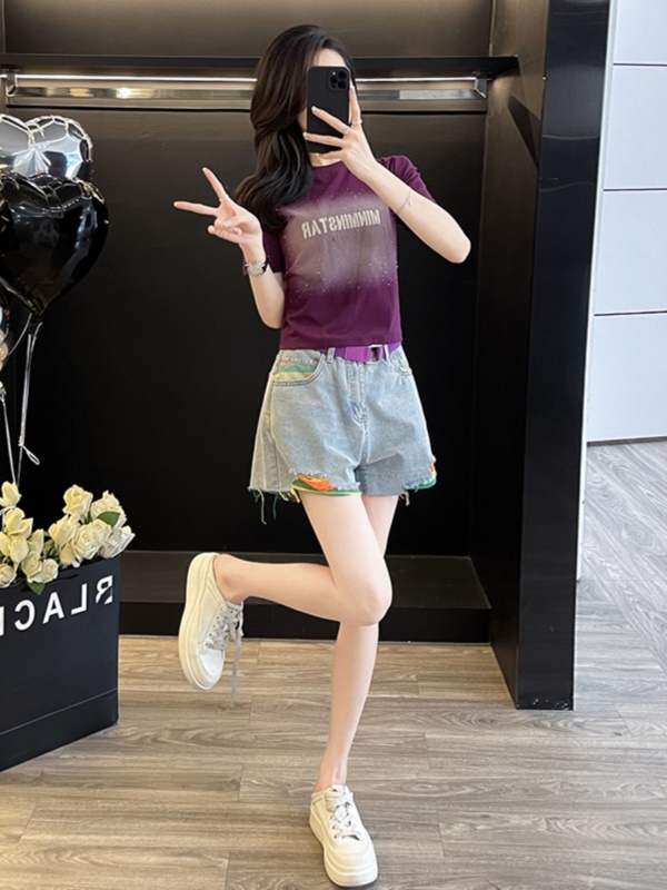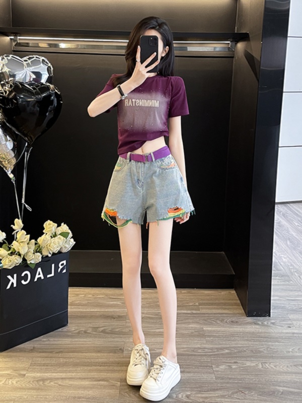 紫色上衣+短款牛仔裤