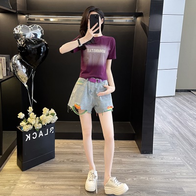 商品名称:多巴胺紫色休闲运动套装女夏季炸街洋气减龄小个子牛仔短裤两件套