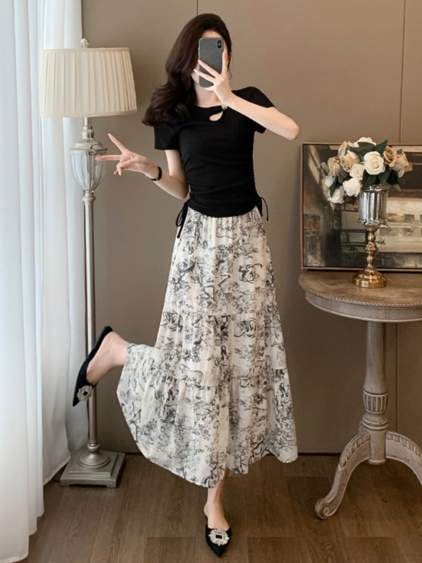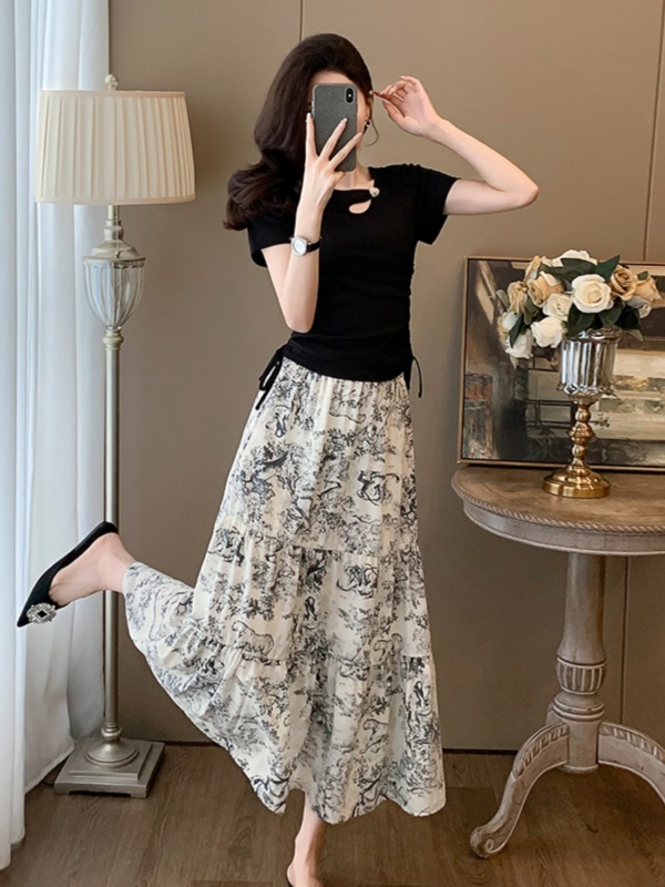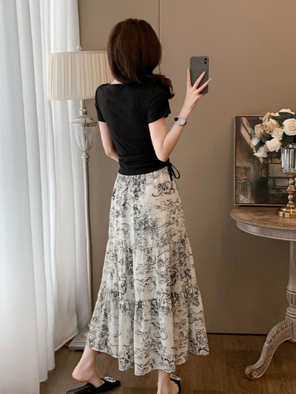 商品名称:古风水墨画半身裙A字裙女2025夏季新款中长款印花伞裙T恤两件套装