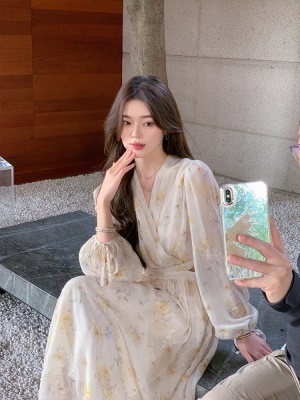 ByYou 夏季新款黄色露腰刺绣雪纺碎花连衣裙长款灯笼袖仙女a字裙