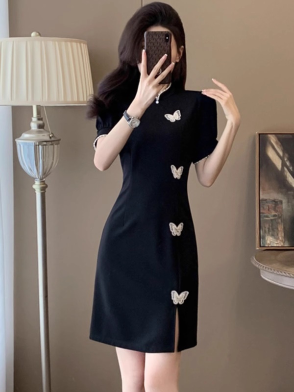 夏季新中式国风改良旗袍短袖连衣裙女气质送考收腰黑色裙子小个子