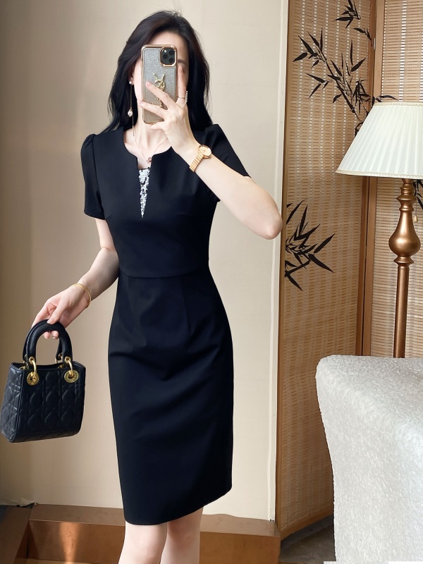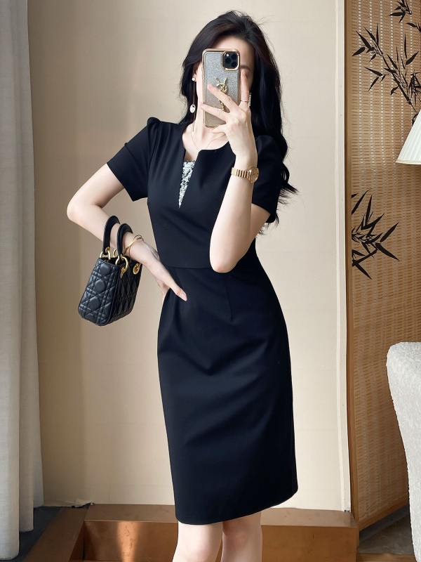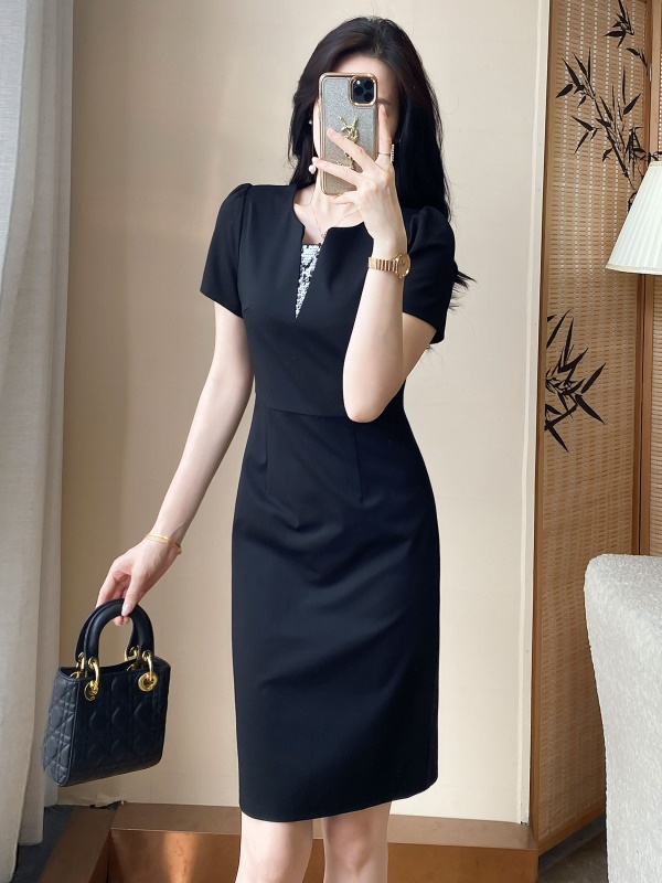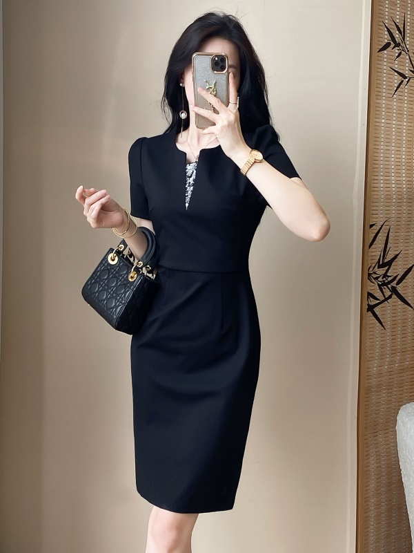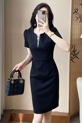 商品名称:黑色修身显瘦职业通勤V领连衣裙2025夏新款气质女神范收腰包臀裙