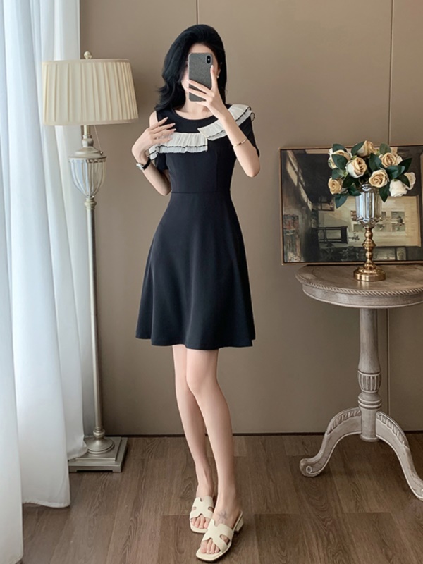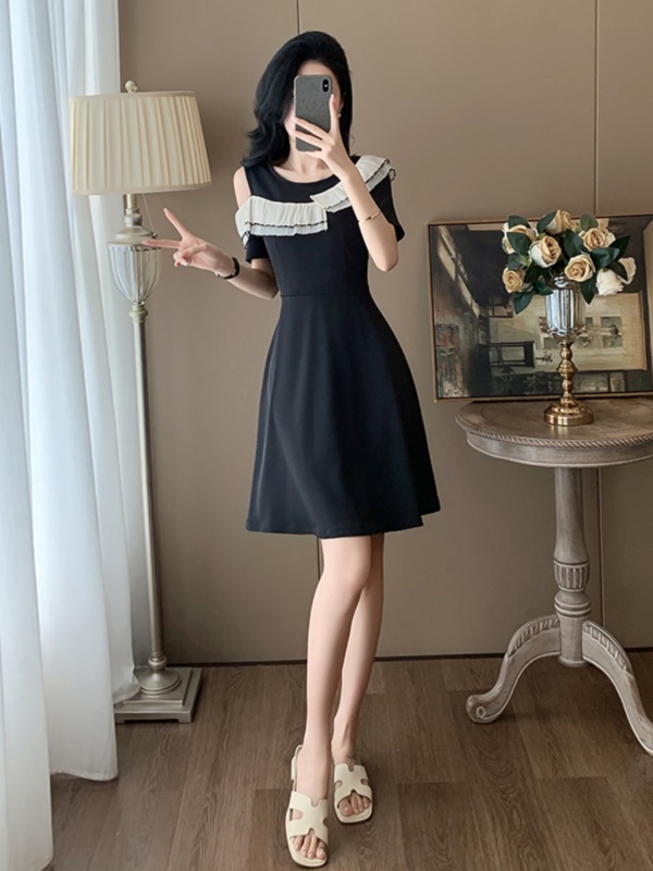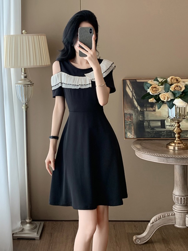 洋气露肩短袖小黑裙子女夏季新款时尚韩版减龄显瘦黑色连衣裙潮