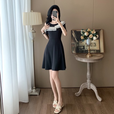 商品名称:洋气露肩短袖小黑裙子女夏季新款时尚韩版减龄显瘦黑色连衣裙潮
