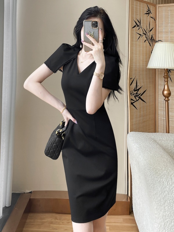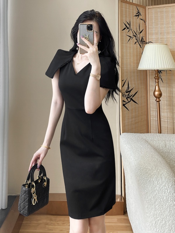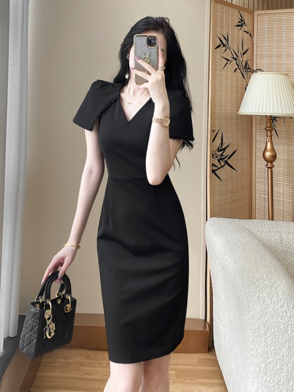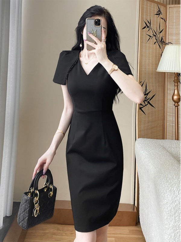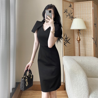 气质干练女神范V领小黑裙子女夏显瘦OL包臀裙高端黑色职业连衣裙