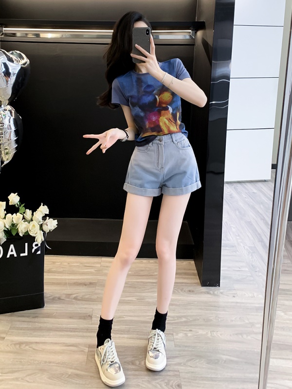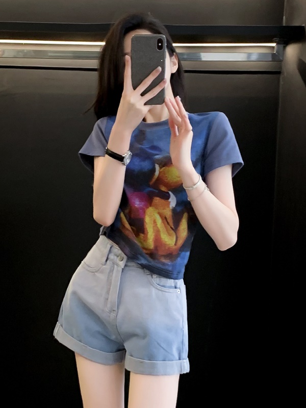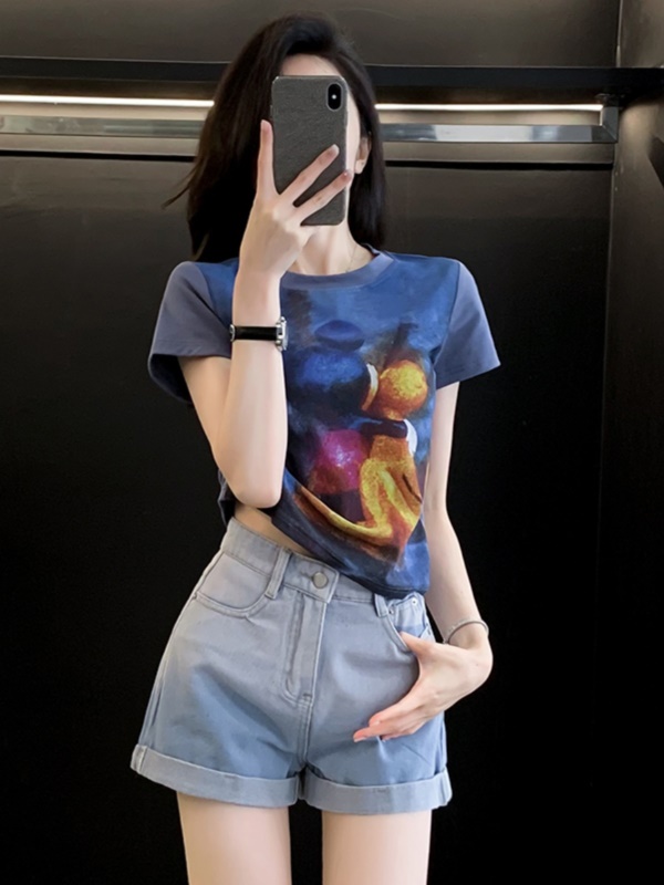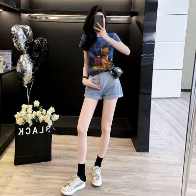 商品名称:多巴胺时尚套装女夏季洋气显瘦印花T恤高腰牛仔短裤两件套小个子