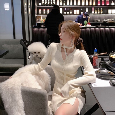ByYou 2025春季纯欲v领白色兔绒织连衣裙收腰性感开叉内搭毛衣裙