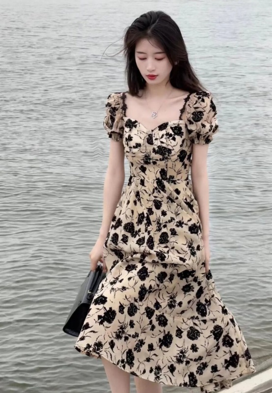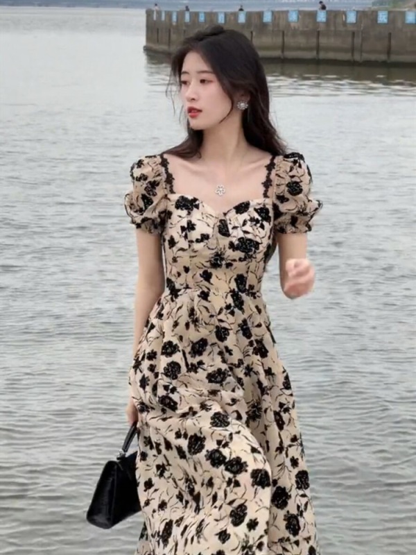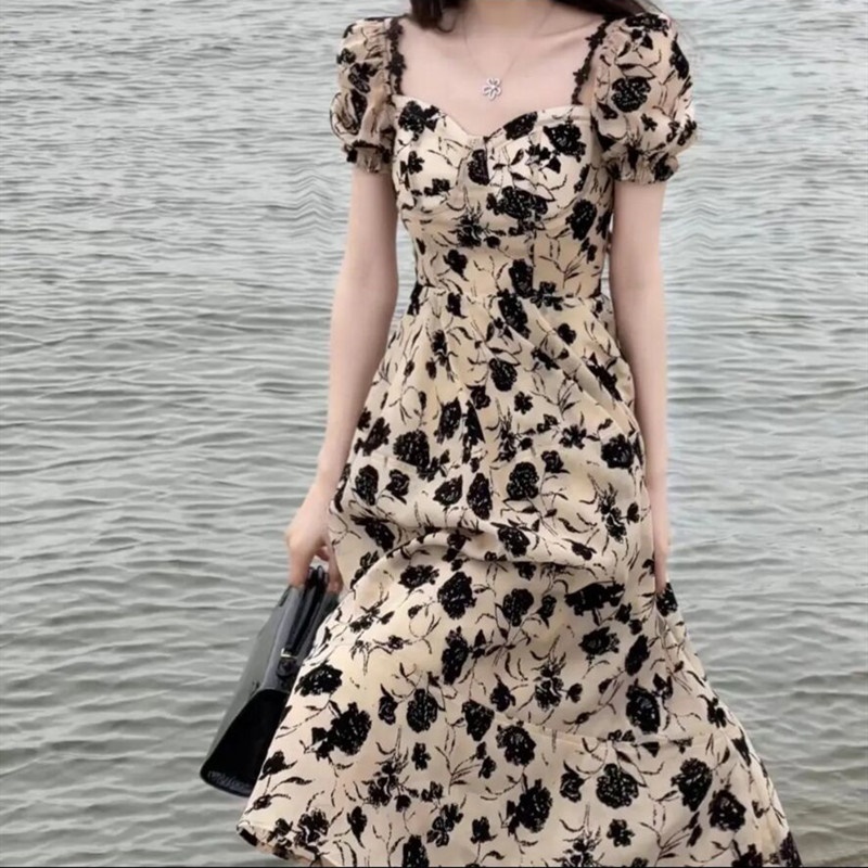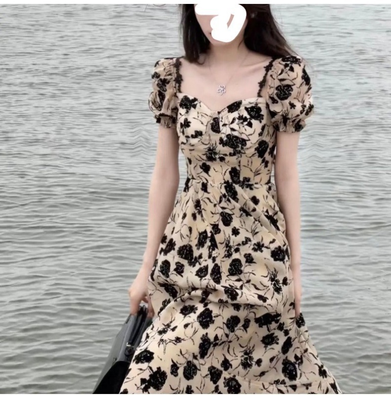 法式别致惊艳收腰长裙高级感显瘦名媛气质碎花泡泡袖连衣裙子女夏