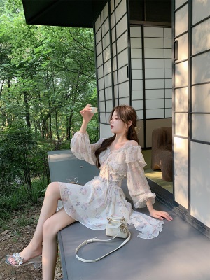 ByYou 夏季新款灯笼袖网纱V领碎花雪纺连衣裙收腰荷叶边短款裙子