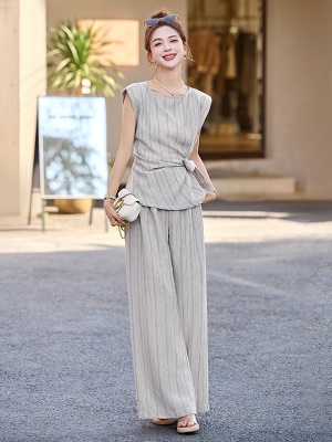 时尚国风亚麻条纹套装女2025夏季新款贵气减龄系带显瘦马甲两件套