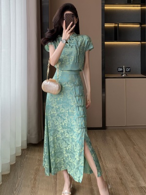 绿色新中式旗袍套装女夏季2025新款气质国风开叉包臀半身裙两件套