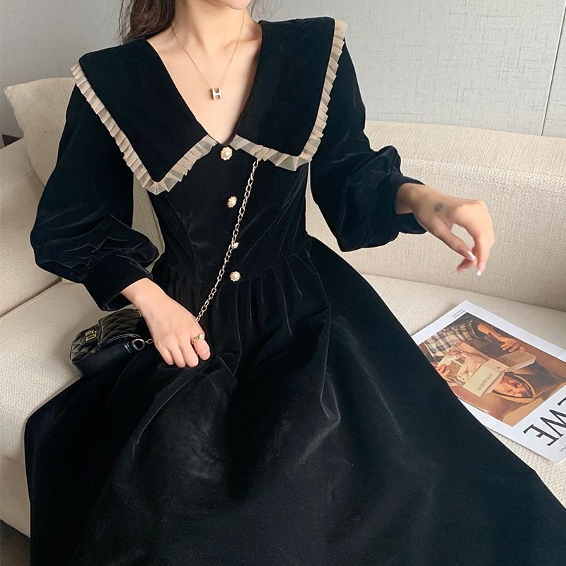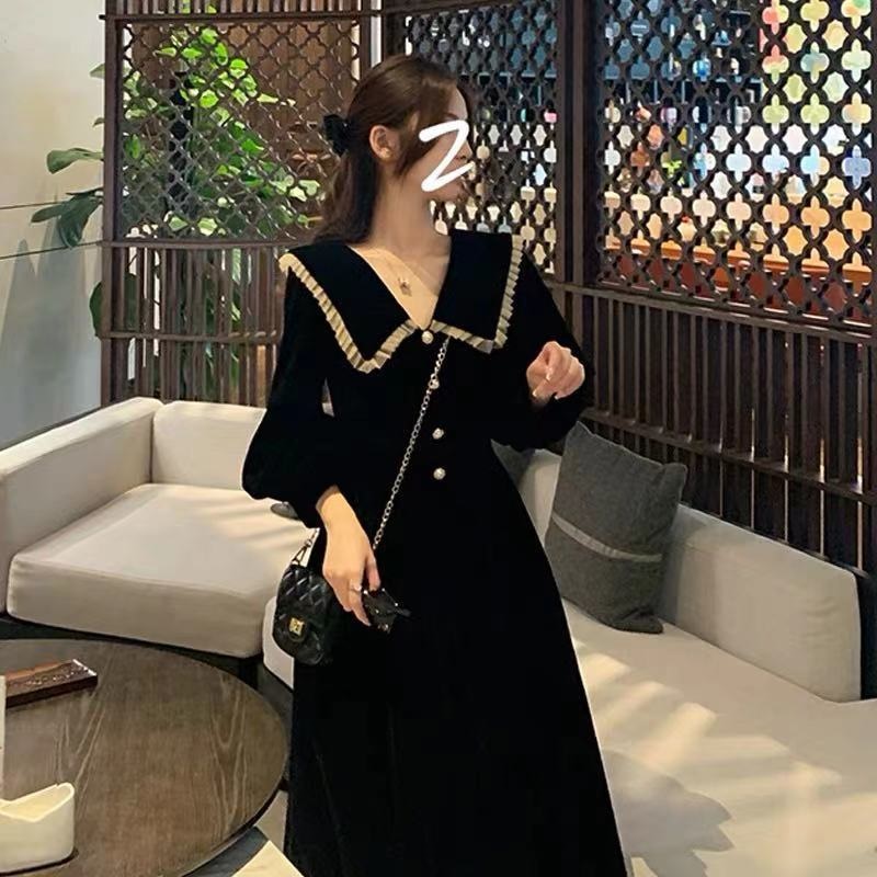 黑色丝绒连衣裙秋冬季新款收腰显瘦中长气质娃娃领复古赫本风长裙