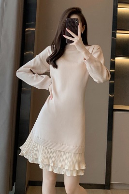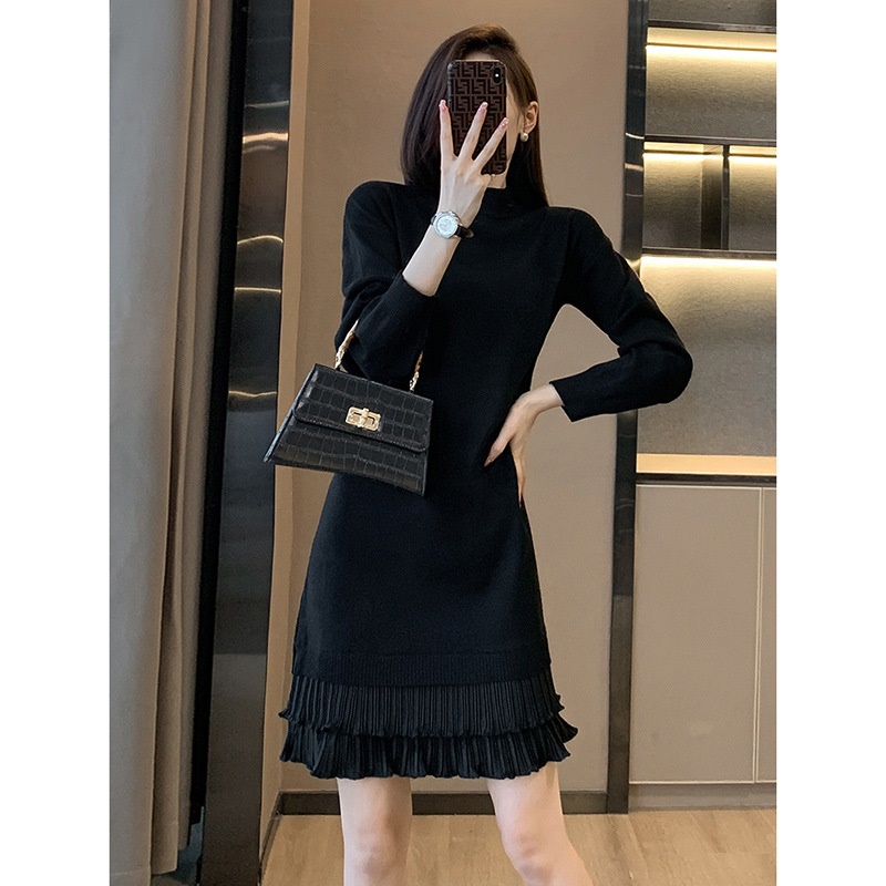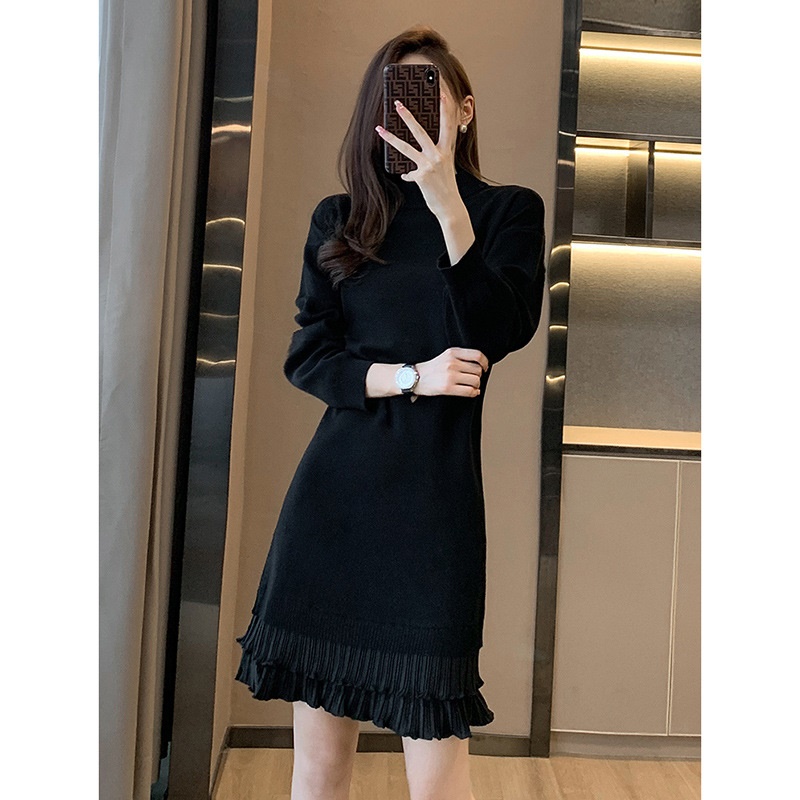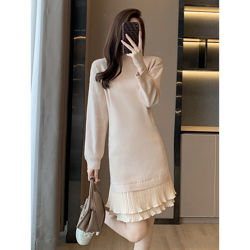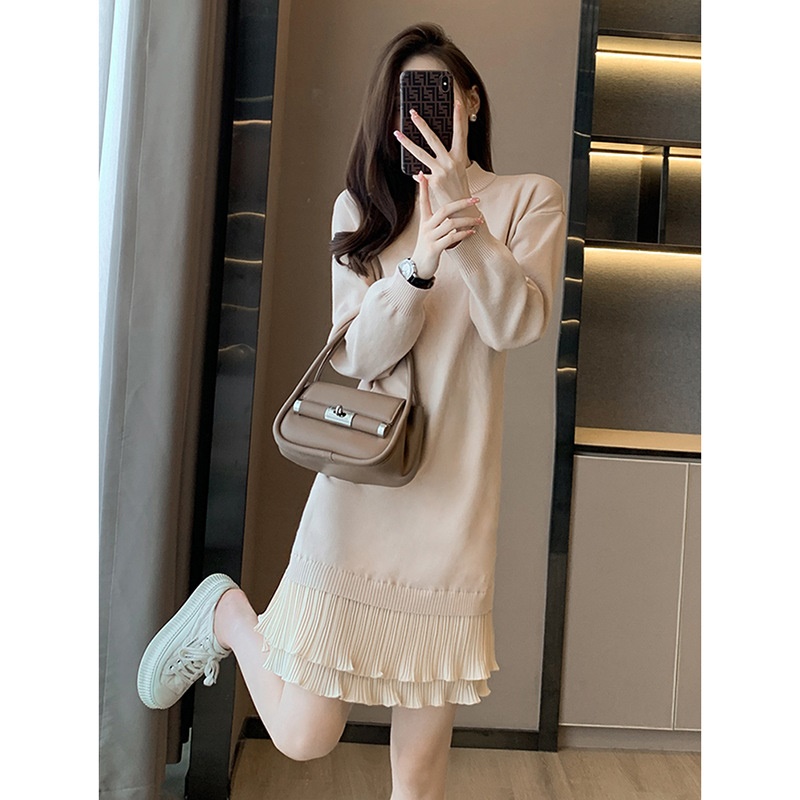 法式针织连衣裙女秋冬打底配大衣内搭中长款小个子假两件毛衣裙子