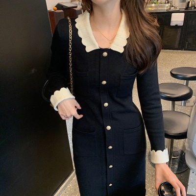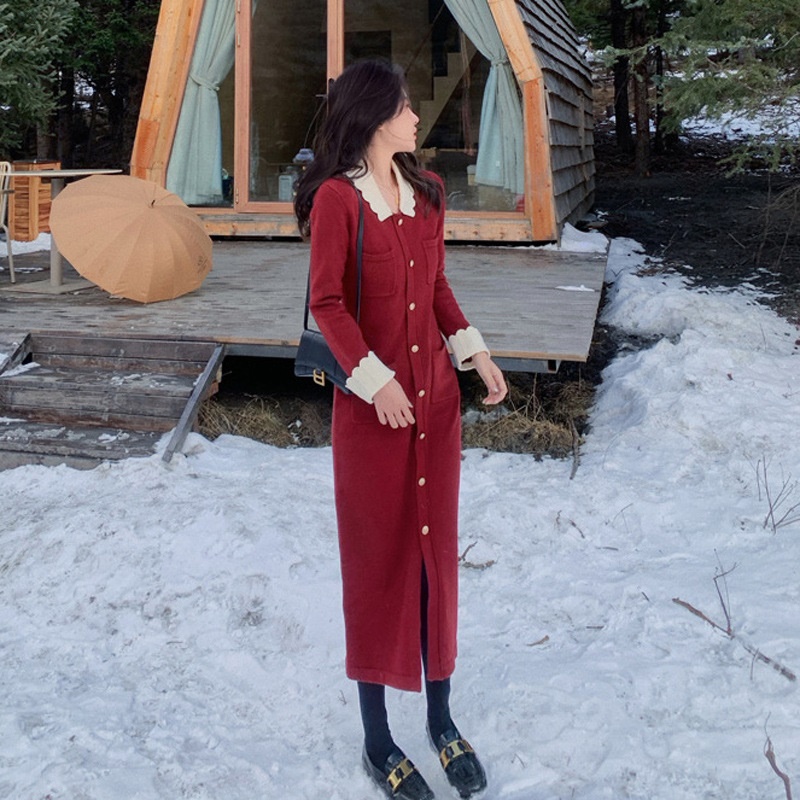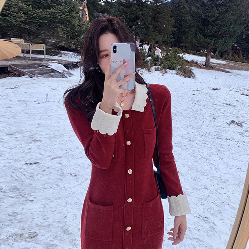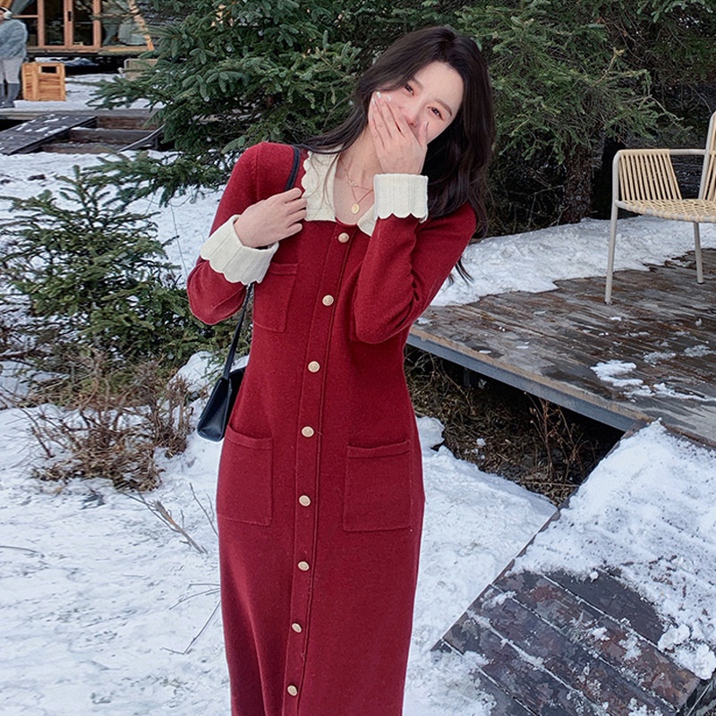 商品名称:圣诞红色气质修身内搭打底毛衣针织连衣裙秋冬新款新年配大衣长裙