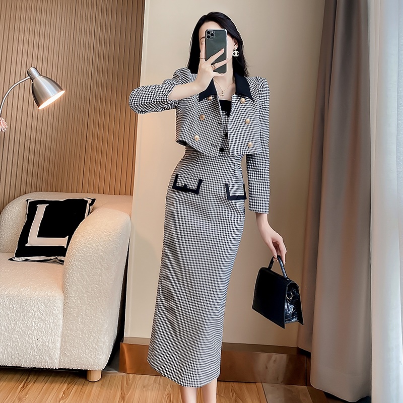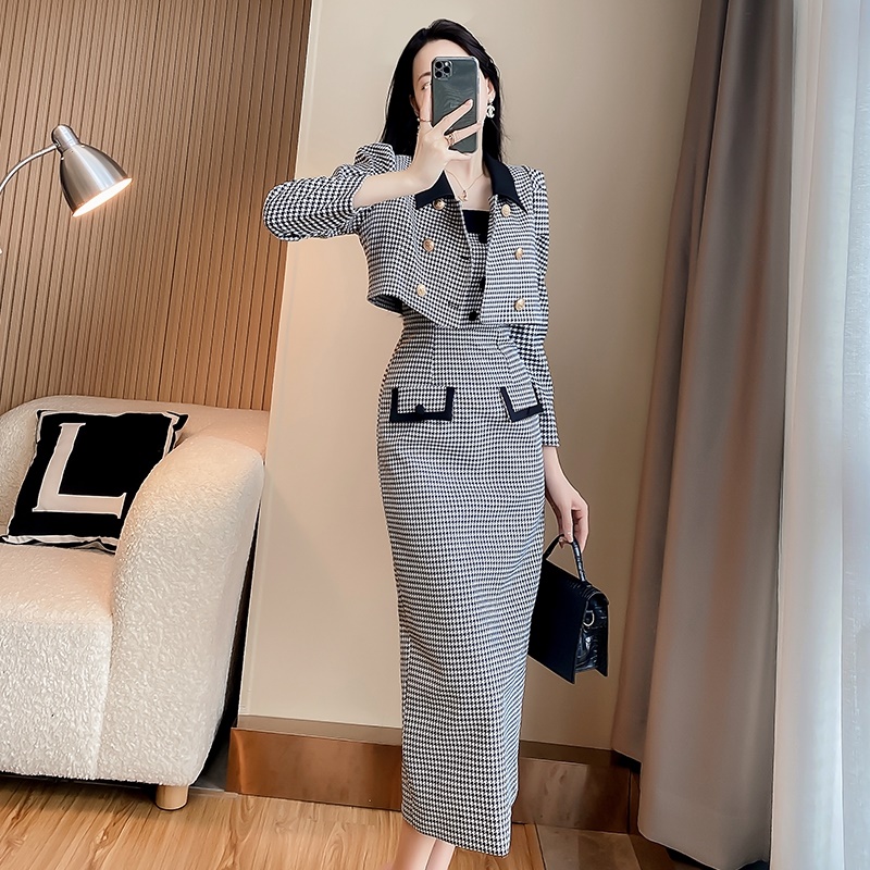 小香风洋装两件套装小外套秋冬新款职业高级感女装格子吊带连衣裙