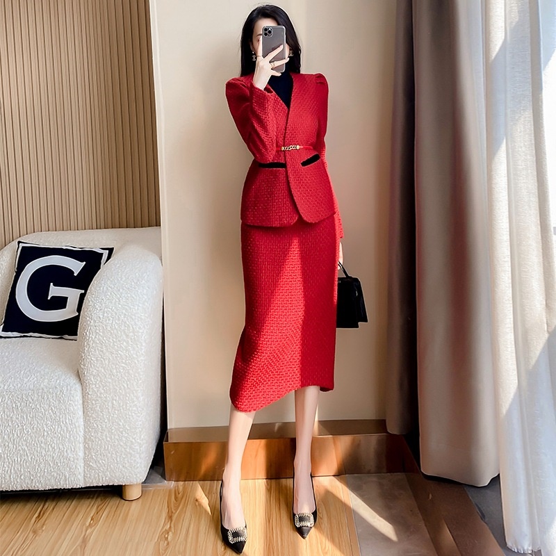 商品名称:小香风套装2025秋冬新款女装红色礼服裙名媛气质轻奢半身裙两件套
