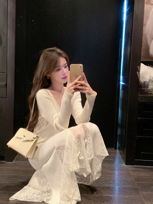 ByYou2025春季v领长袖拼接蕾丝白色兔绒针织连衣裙长款内搭毛衣裙