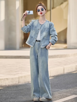 欧货洋气牛仔圆领套装女2025春季新款超火气质小香风工装风两件套