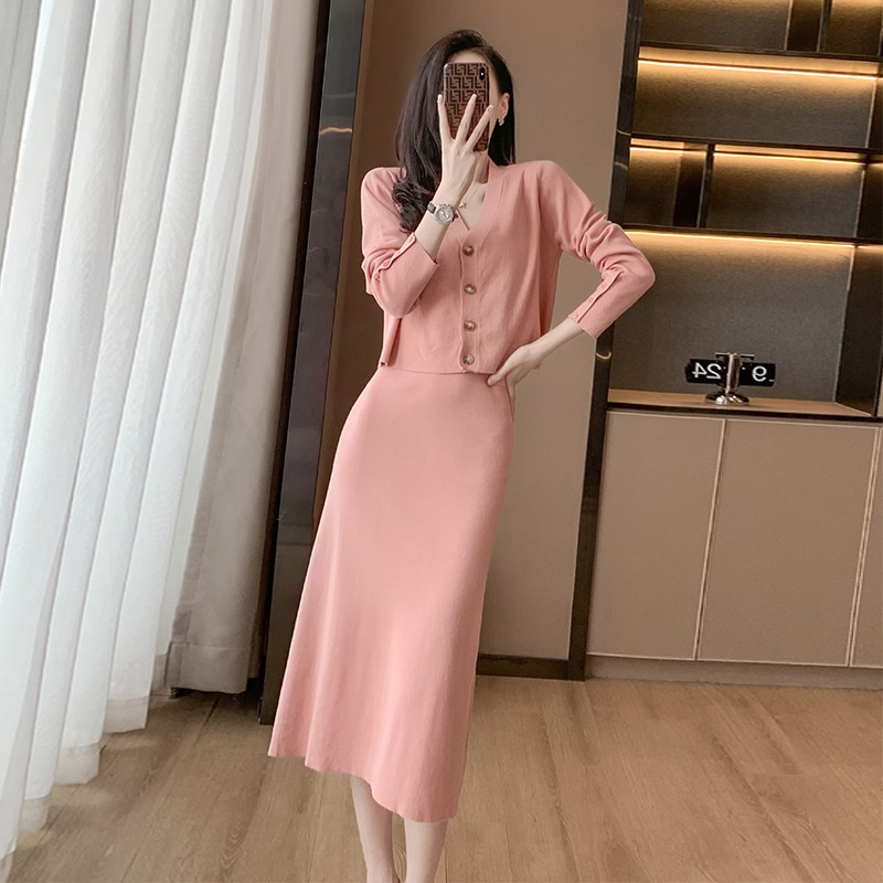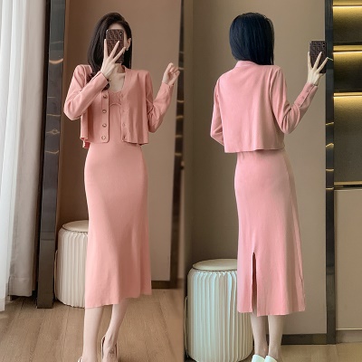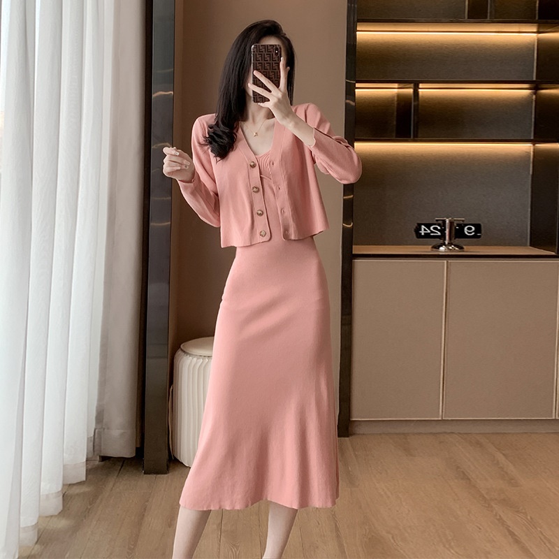 商品名称:气质女神范针织吊带长裙两件套高级感法式开衫搭配粉色连衣裙早秋