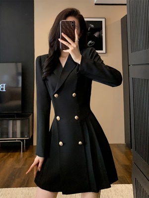 黑色西装连衣裙子双排扣职业西服长袖女春高级感气质赫本风小黑裙