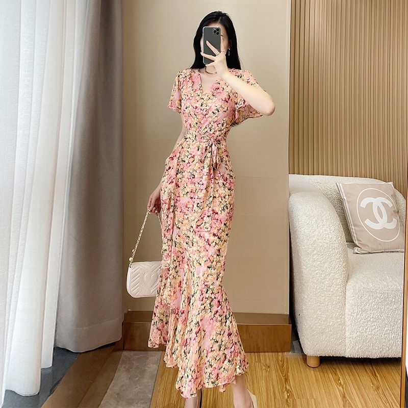 茶歇法式连衣裙女夏2025夏季新款女装碎花雪纺气质仙女显瘦长裙子