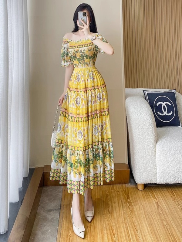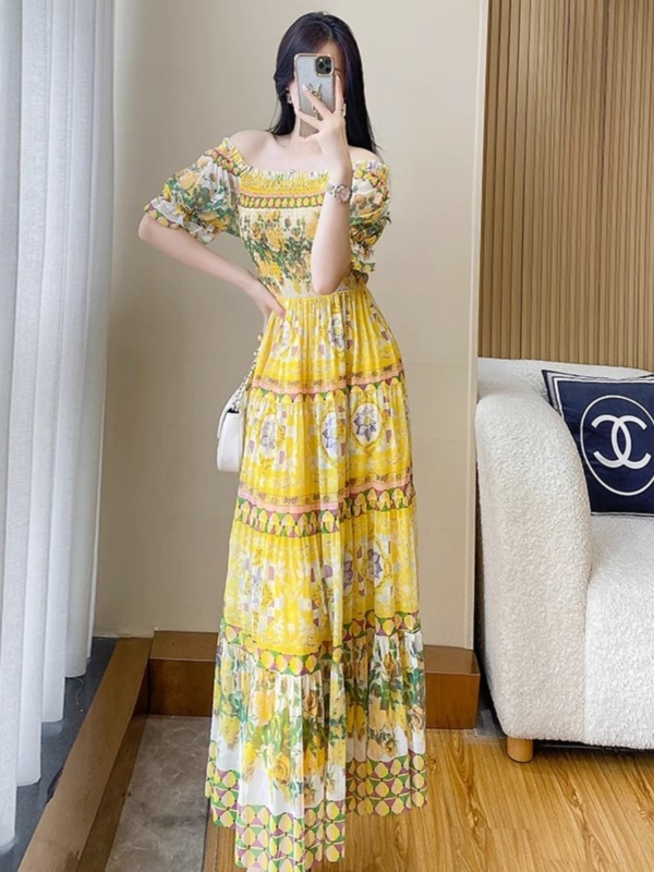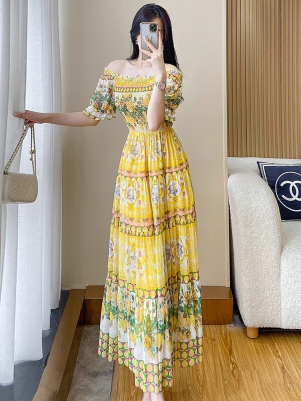 波西米亚沙滩长裙子女夏季新款高端气质度假碎花雪纺一字领连衣裙