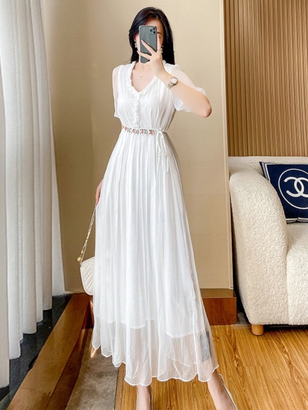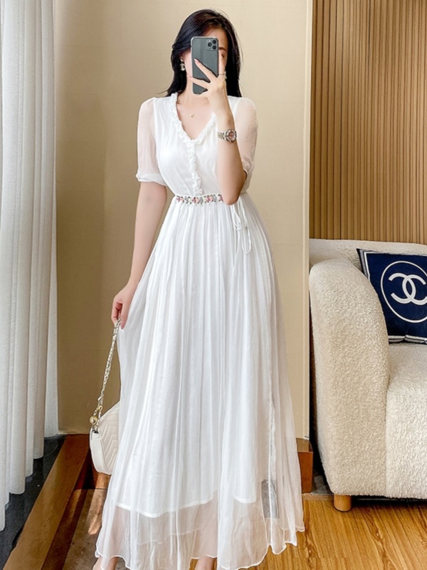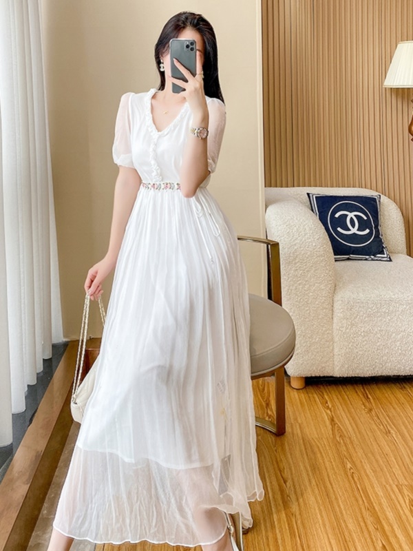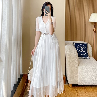 2025夏季新款女士白色V领雪纺连衣裙气质收腰显瘦法式高级感长裙