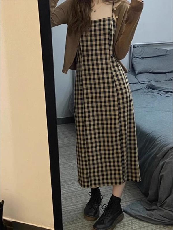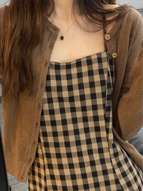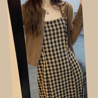 商品名称:早秋装搭配一整套穿搭2025新款小香风格子长袖连衣裙女开衫两件套