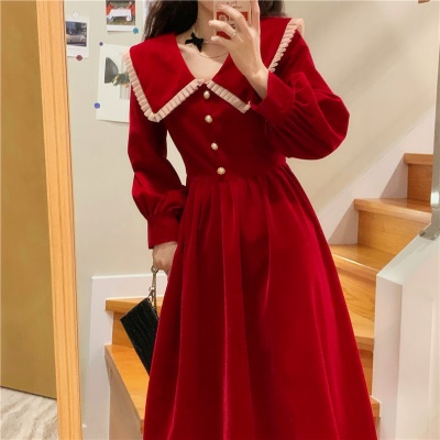 赫本丝绒娃娃领红色订婚连衣裙秋冬长裙高级感礼服裙高端轻奢小众