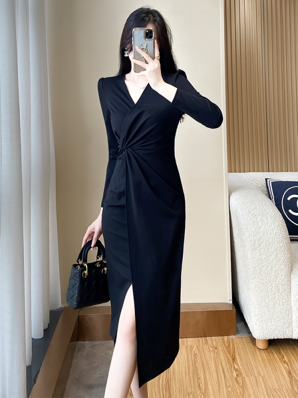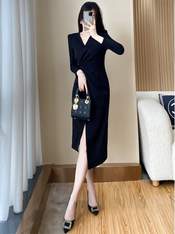 秋季新款黑色连衣裙气质显瘦高级感开衩长裙子修身高端赫本小黑裙