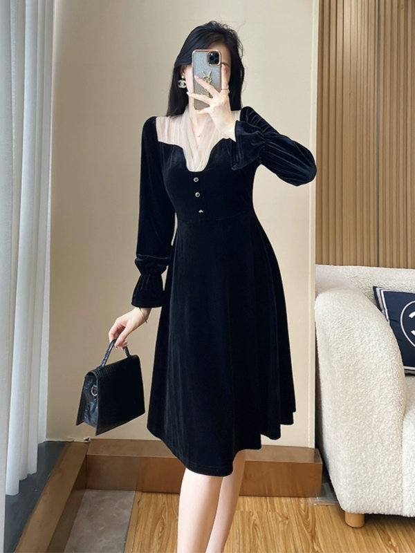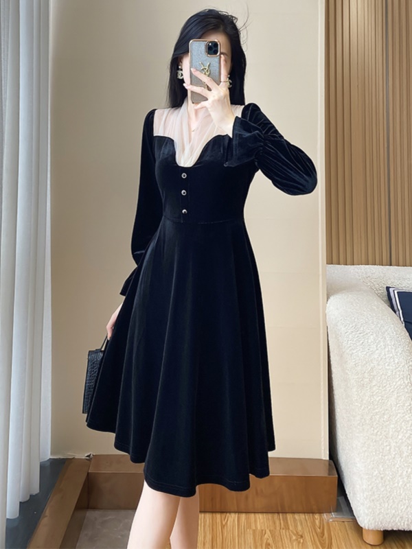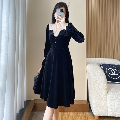 富家千金黑色丝绒礼服连衣裙女高级感秋冬季法式复古赫本小黑裙子