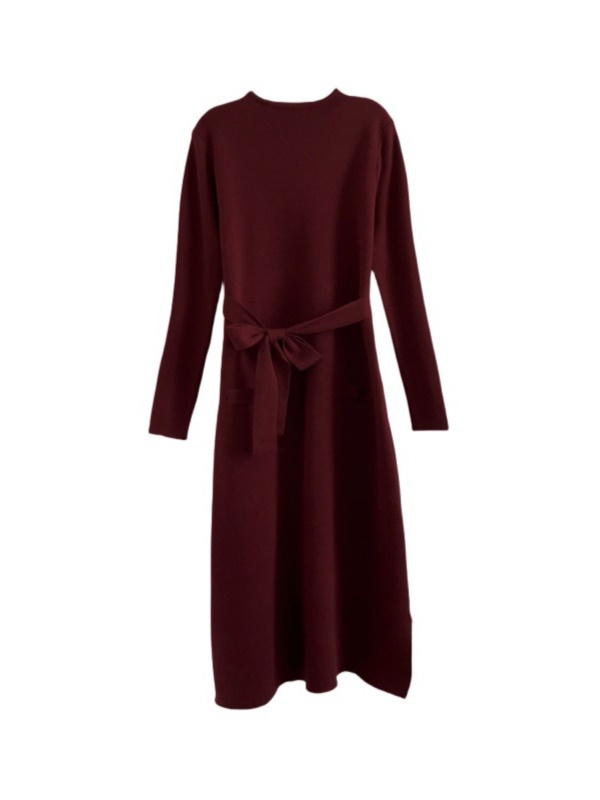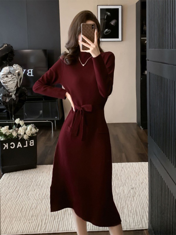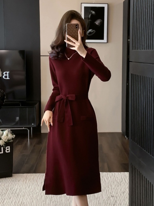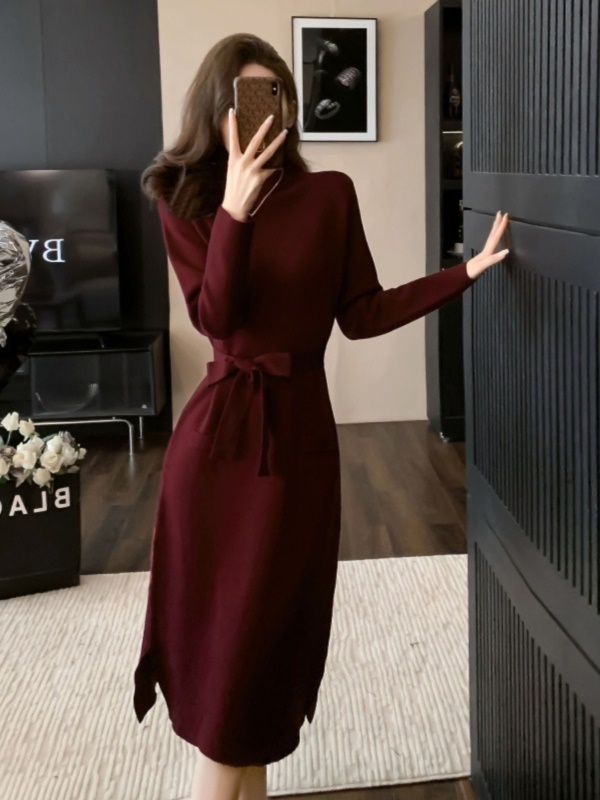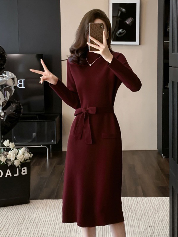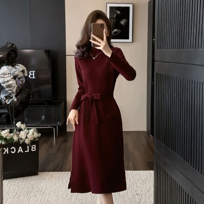 商品名称:法式复古秋冬新款高级感酒红色针织连衣裙百搭打底配大衣毛衣裙子