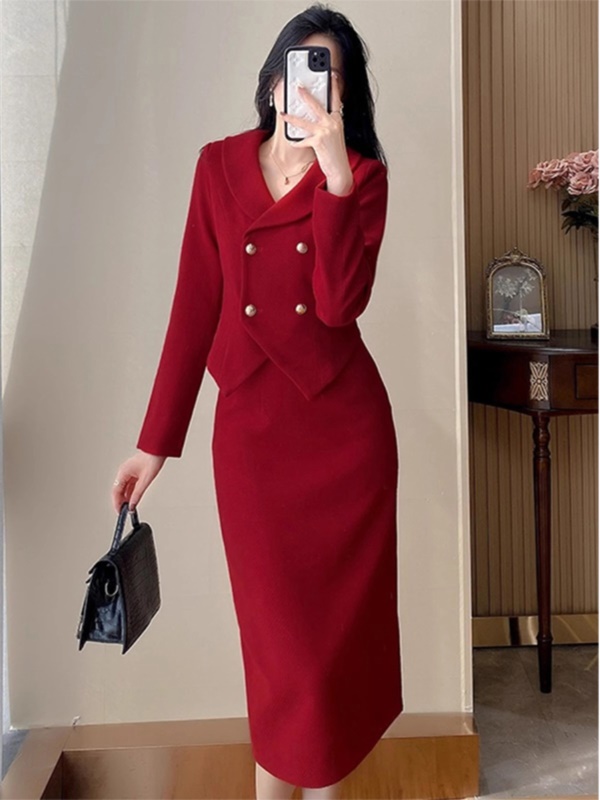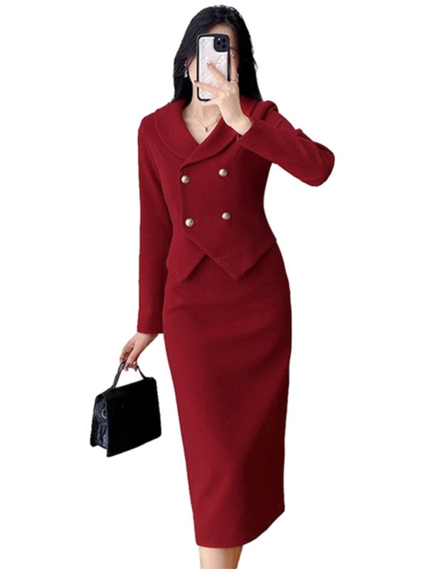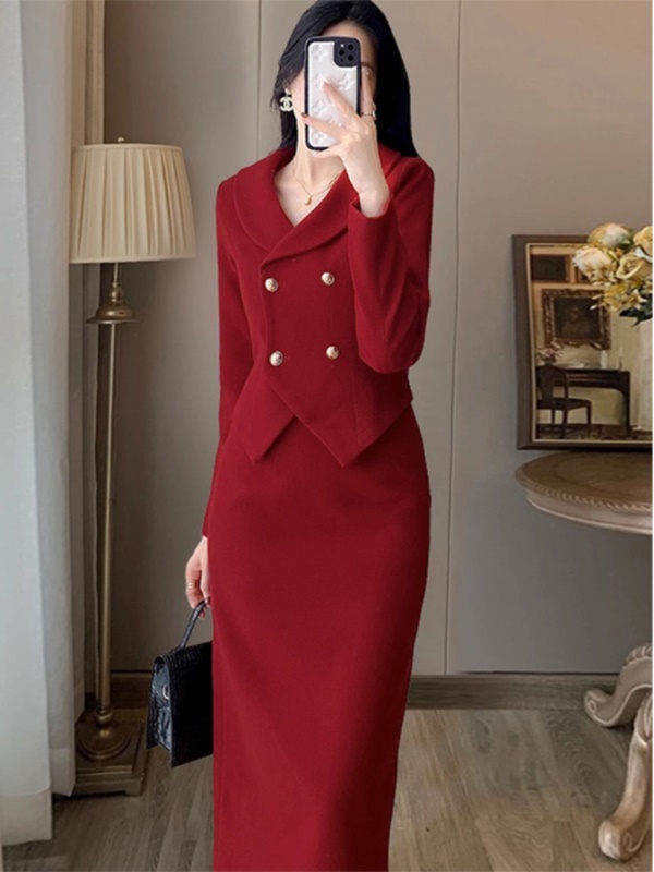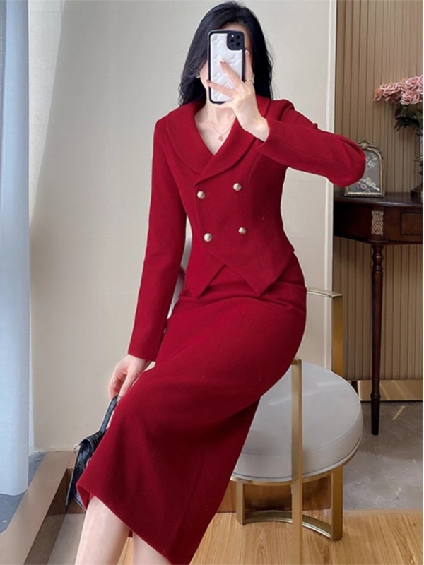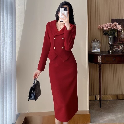 商品名称:冬季过年新小香风红色套装裙女新款毛呢气质名媛订婚高级感两件套