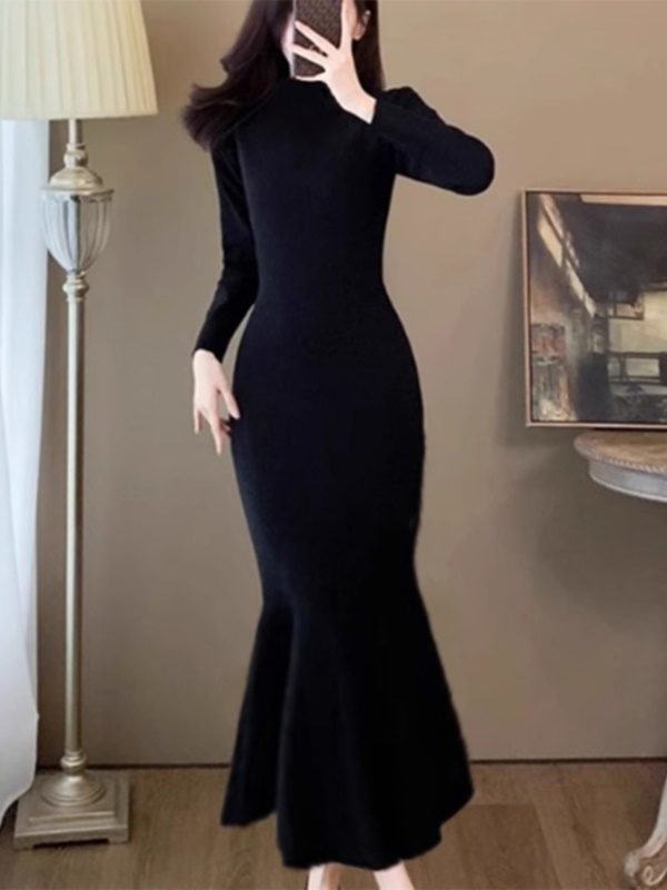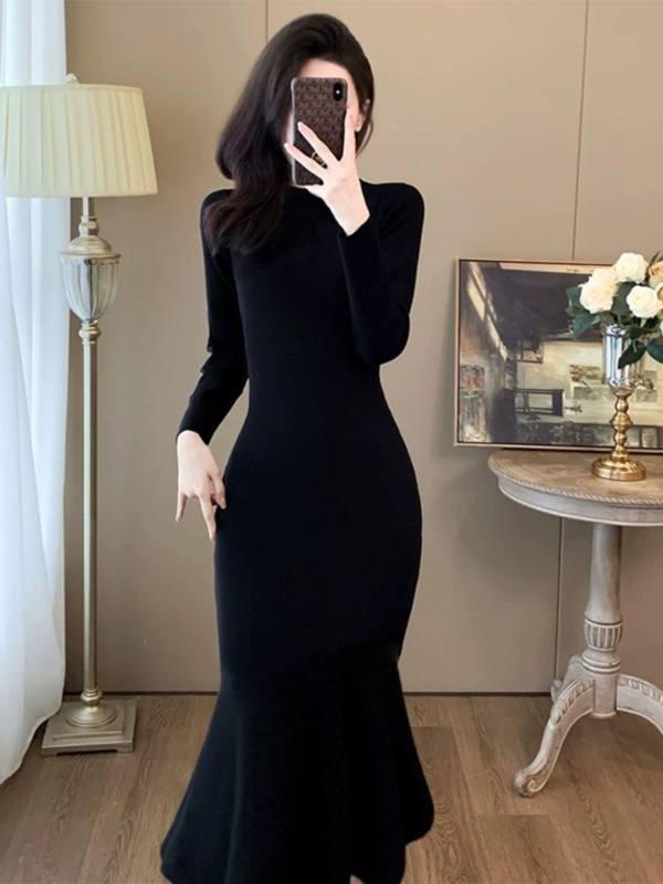 法式赫本风黑色打底针织连衣裙女秋冬季配大衣内搭长款毛衣鱼尾裙