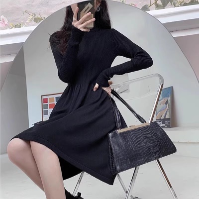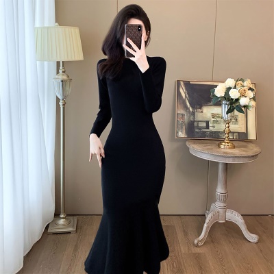 商品名称:法式赫本风黑色打底针织连衣裙女秋冬季配大衣内搭长款毛衣鱼尾裙